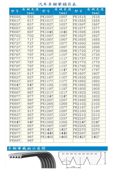 橡膠多楔帶兼 有v帶和平帶二者的優(yōu)點,既有平帶的柔軟、強韌的特點,又有v帶緊湊、高效等優(yōu)點。它的主要特點如下:1.傳動功率大,空間相同時比普通V帶的傳動功率的高30%。 2.傳動系統結構緊湊,在相同的傳動功率情況下,傳遞裝置所占空間比普通V帶小25%。 3.帶體薄,富有柔軟性,適應帶輪直徑小的傳動,也適應高速傳動,帶速可達40m/s;振動小,發(fā)熱少,運轉平穩(wěn)。 ![]() 我公司主產的汽車多楔帶按照使用材料主要分為氯丁橡膠多楔帶和三元乙丙橡膠多楔帶。 |